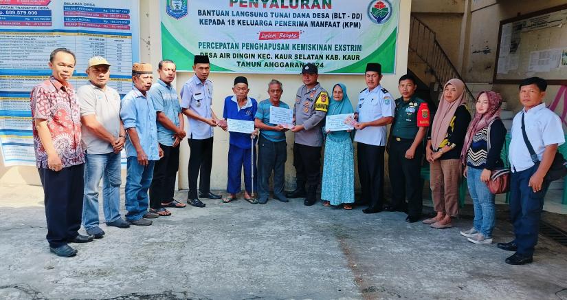 "Tahun 2024 program BLT-DD khusus penanganan miskin ekstrim, dengan kriteria warga miskin ekstrem, Lanjut Usia (Lansia), warga dengan Kepala Keluarga (KK) Tunggal dan warga miskin memiliki penyakit menahun dan juga saya sangat aspriasi sama Desa Air Dingin ini untuk pembagian BLT DD 2024 selalu cepat semoga saja kerja Kades dan Perangkat Desa harus bekerja lebih keras lagi.," tutup Camat